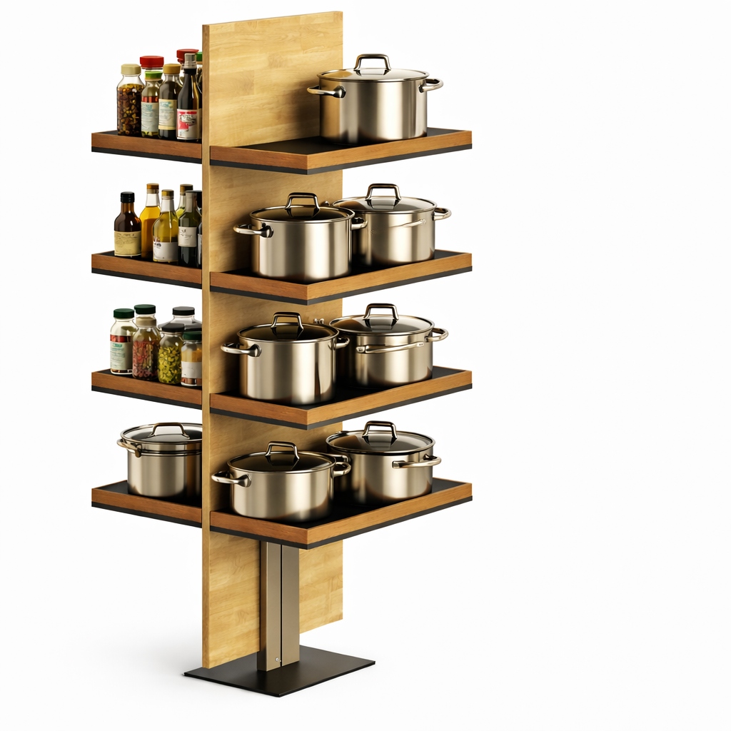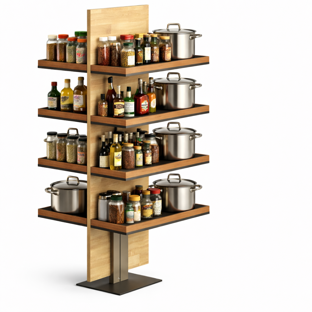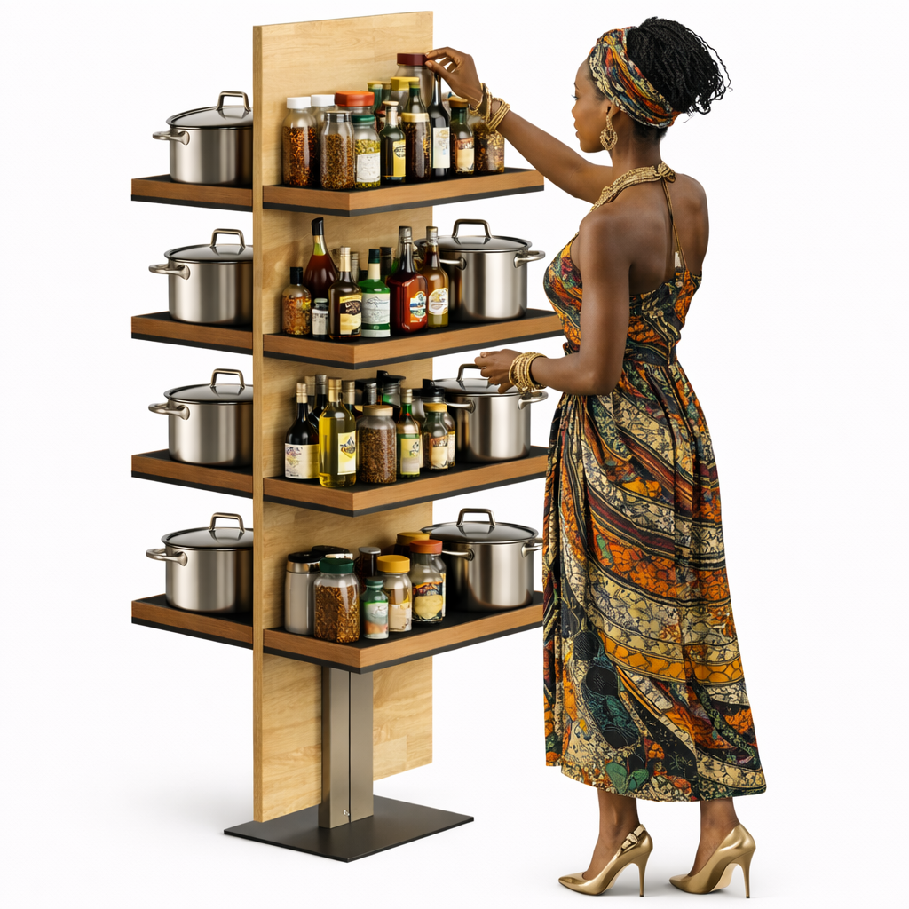 A compact, revolving storage rack designed to keep everyday kitchen essentials organised, visible, and within easy reach — without cluttering your workspace.